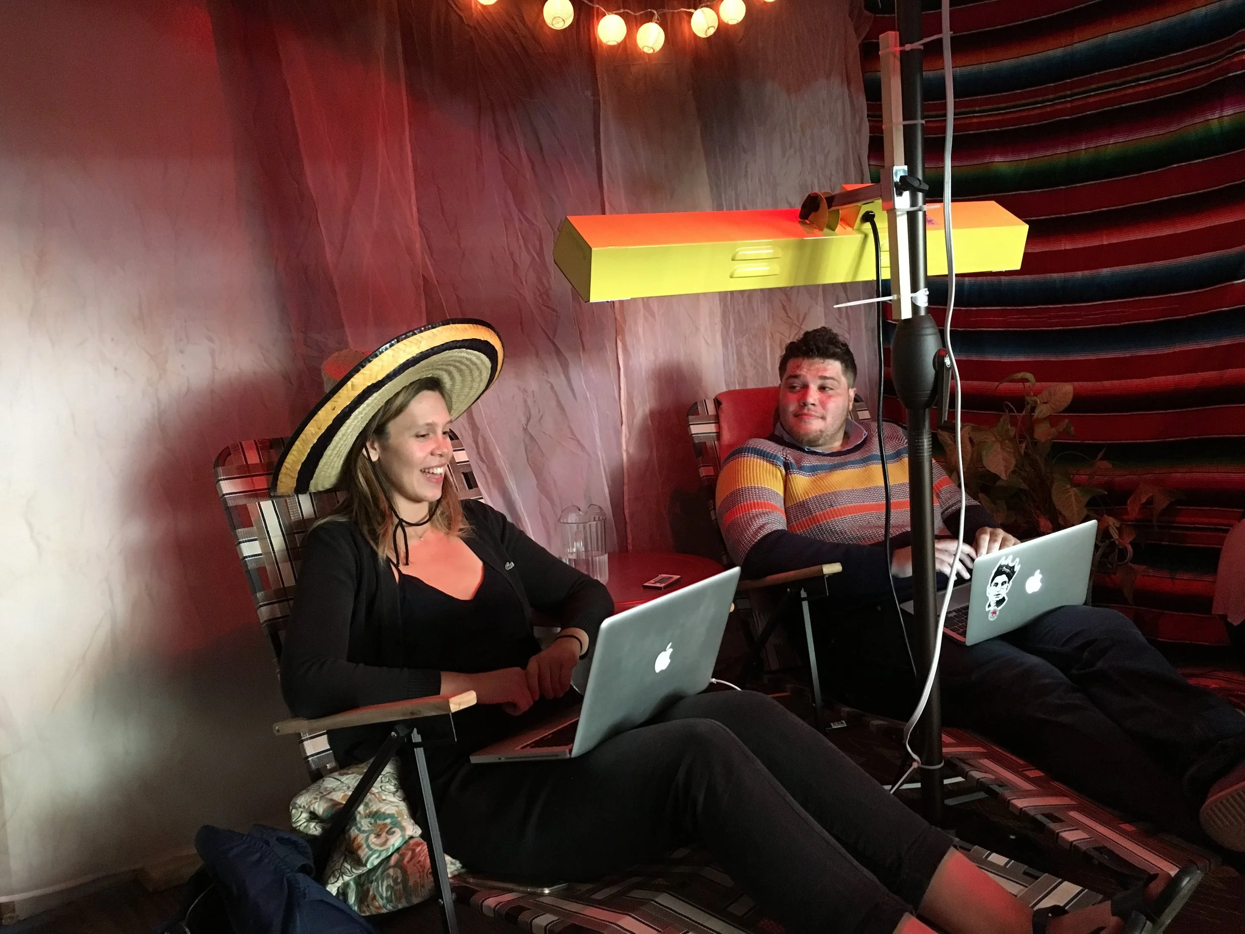 Indoor beaches apparently are nothing new. But they certainly add an odd and unexpected dimension to a space that is typically cold, dark, and/or stuffy. We have built a few iterations of them over the years, but our favorite (featured in the top images) was constructed out of a simple and lightweight wooden frame, golden space blankets, a roll of astro-turf, a couple of reclining deck chairs, a small knock-off tulip table, and two clop-on non-filtered 250-watt heat lamps. Being careful to select the right housing for the heat lamps (they require a ceramic base, high-capacity clip-on light fixture that will not melt and cause a fire!!), and to position them well away from the flammable space blankets (!!), we achieved a warm, sunny, tropical ambiance in the middle of a dark and cold room in winter. The heat and light, both reflected off of the gold foil of the blankets, had a gloriously artificial warmth to it, but when you closed your eyes, it felt as if you were out in the real sun. Personally, my favorite thing about the fake beach is the boldness with which it defies season, time of day, and formal conventions of interior space.