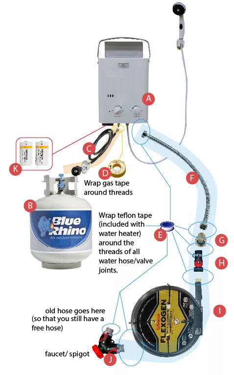 Connect your bits, following the diagram above, and remember to wrap teflon tape around the male (exposed) threads (give it maybe 2-5 wraps per joint), and where the gas meets the water heater, use yellow gas tape in a similar fashion. Hang the heater unit on a screw head (screw in a sturdy screw onto the mounting surface, leaving a centimeter of screw exposed), and position the propane tank below this, with the tank's valve set to 'open'. When all is set up, close your garden hose on/off valve (H), open the feeding side of your hose splitter (J), and close the other side of the splitter, and turn on your spigot. If you've properly connected everything, there shouldn't be any leaks anywhere, despite the water being 'live' inside of your feeder hose and connections. If no leaks are present, just leave your spigot on, and control the on/off to your shower from the on/off valve (H) right below your heater. Make sure your batteries are inside of your heater, switch the unit ON, and try testing the heater. Water flow should ignite the heater, and after 5 seconds or so, your water should be hot. Adjust the gas and water flow valves to get a temperature you like, and you're done! I leave the aesthetics up to you, but keep in mind that if your water is not going into a drain, you might want to consider only using biodegradable soap so that you do not damage your plants or soil.