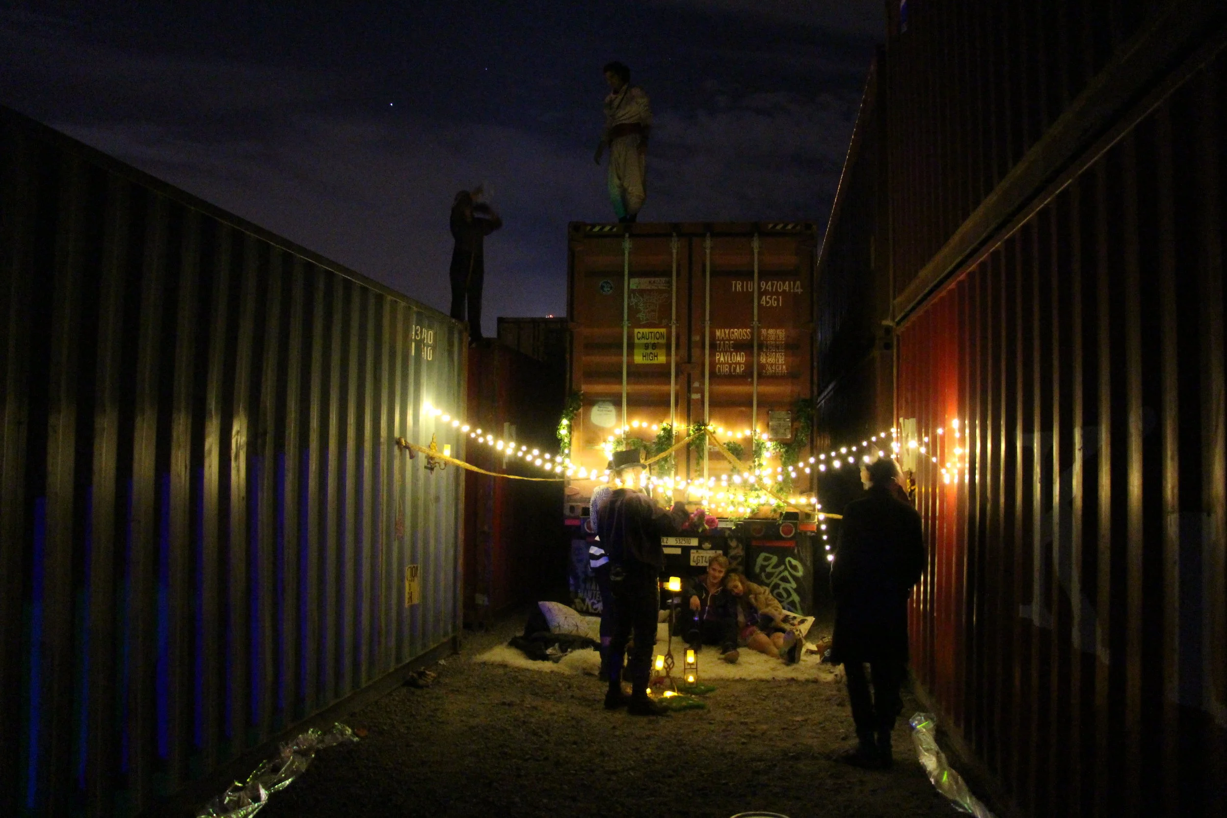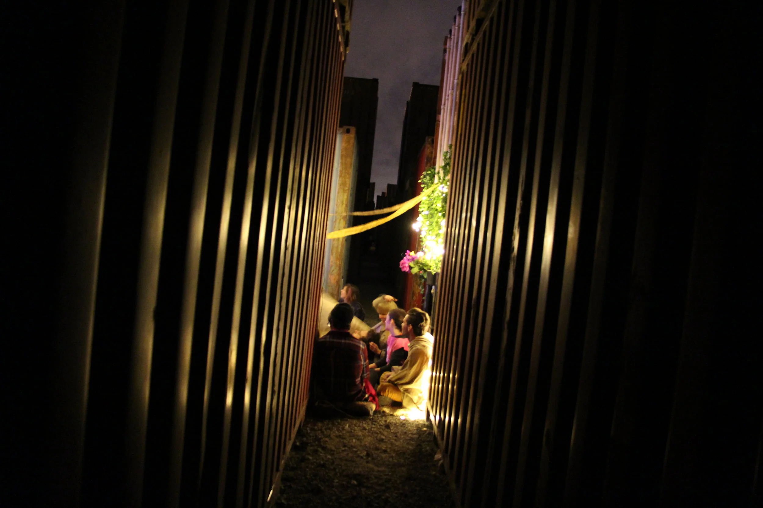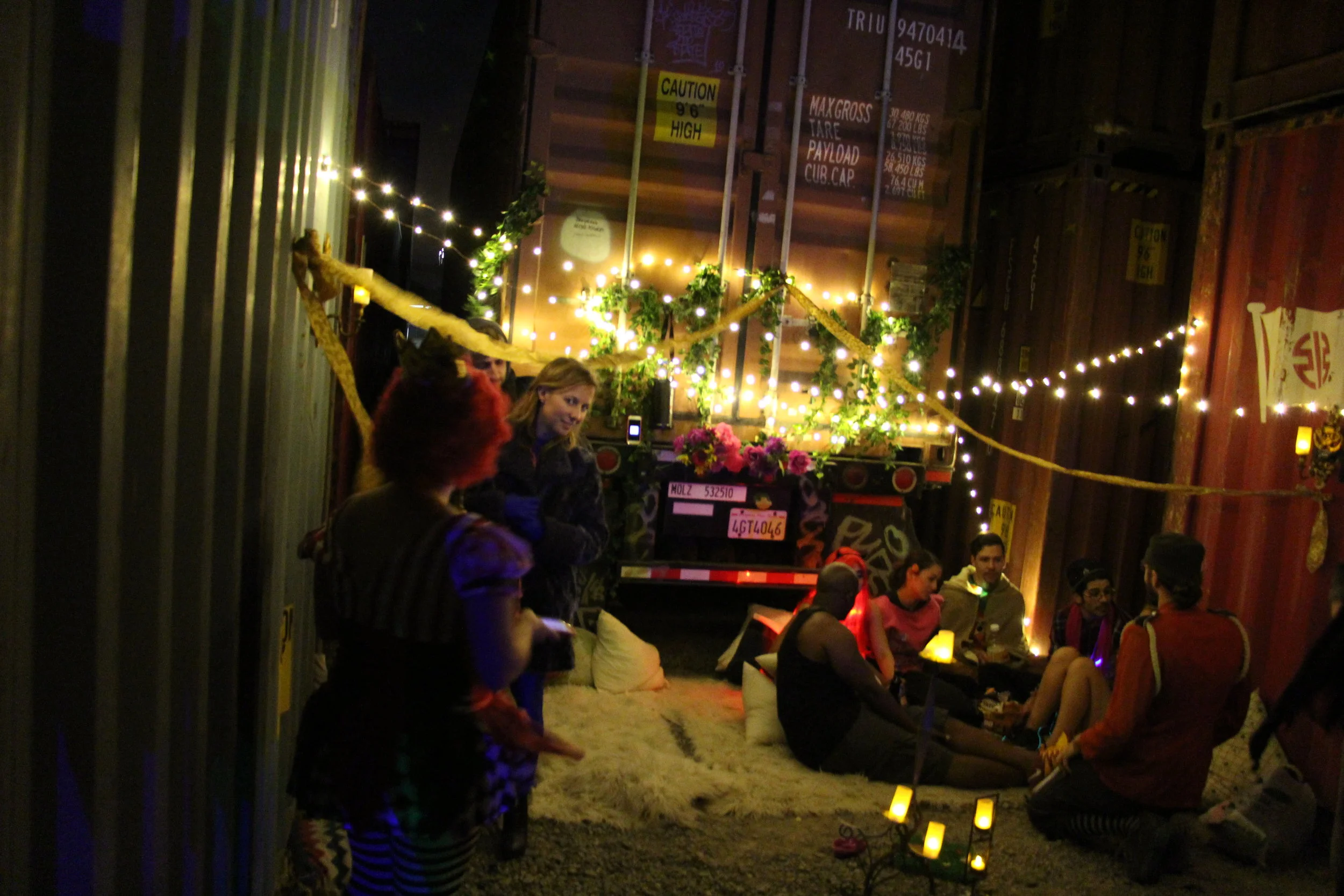 This project was whipped together for an experimental event in the desolate infrastructural spaces of Treasure Island. The goal was to rapidly create a warm, cozy space sited in a harsh, austere infrastructural context. There was a peculiar pleasure in so cozily occupying such a harsh and hardened terrain, with the corrugated textures and dark silhouettes of the steel containers producing a sense of dismal surrounding that the warm lights, fur rugs and leafy foliage of our installation seemed to hold in abeyance. This was one of the earliest instances in which we experimented with the concept of situated postmodernism—a term that refers to the siting of affective enclaves that intentionally interact with the detritus and flows of late capitalism. By so situating enclaves within the infrastructural terrains of late capitalism, these kinds of projects create a comfort that is affectively impacted by its position within larger (often deleterious) processes.